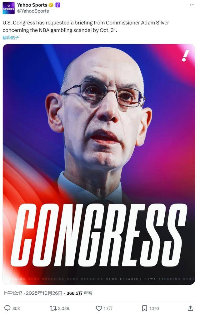 国会要求的简报期限10月31日迫在眉睫,萧华将如何应对立法者的质询?NBA与体育博彩公司的合作是否会被重新评估?这场风暴才刚刚开始,它可能永远改变美国职业体育与赌博的关系,对球迷而言,唯一的要求很简单:一个干净、公正的比赛返回搜狐,查看更多