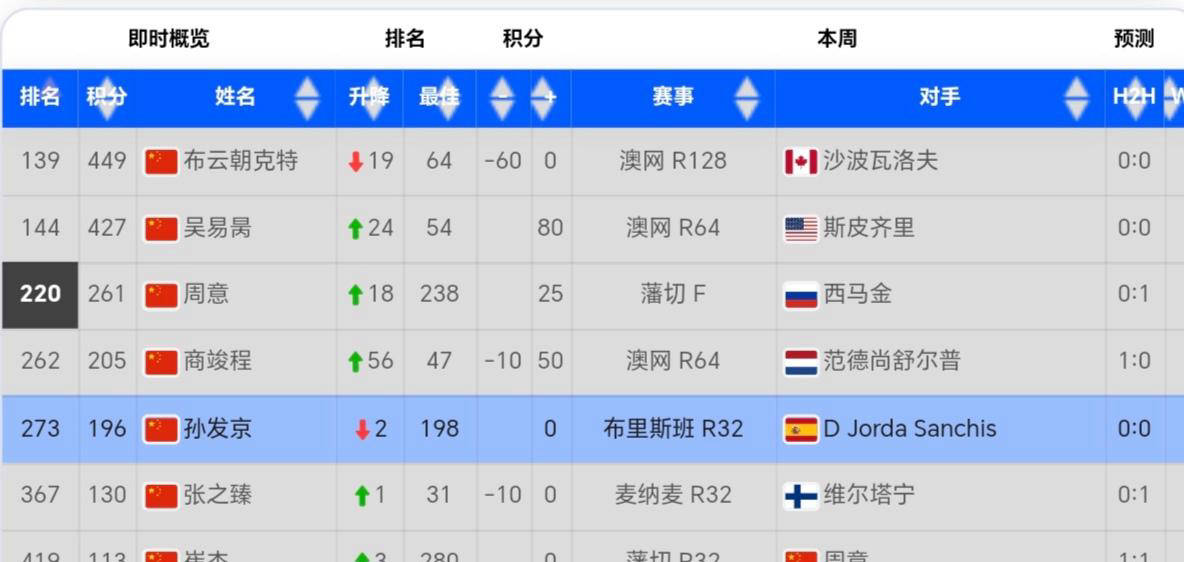 此外,美国选手弗里茨凭借近期优异发挥攀升两位,成为美国男单“一哥”,谢尔顿则跌出两名。中国男网方面,目前无人挺进世界前100,但商竣程和吴易昺展现出了强劲势头,在澳网分别取得一场正赛胜利后,排名大幅提升56位及24位,跻身重返百强的行列充满希望。相较之下,布云朝克特由于未能突破大满贯正赛阶段,排名跌至第139位,明显急需实现重大突破。