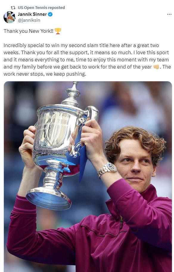 比赛结束后,辛纳在推特上发表了感言:“感谢纽约,这是一个令人难以置信的特殊时刻,在这里我赢得了自己的第二座大满贯冠军。非常感激你们的支持,这对我意义重大。我热爱这项运动,它是我的一切。感谢我的团队和家人,我们应该开始享受这一刻了。”