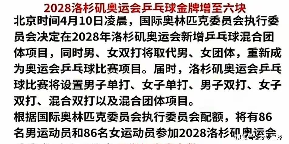 美网,美国网球公开赛,US Open,美网2025,美网直播,美网签表,美网投注,网球四大满贯/【2025美网】美国网球公开赛US Open最新赛程签表、比分直播、球员动态、冠军预测全掌握!关注美网四大满贯盛事,获取最新赔率与投注资讯。有人会问,国乒不是一直横扫奥运吗?但今年洛杉矶奥运,如同给顶尖队伍添了一道隐形障碍。原本看似金牌数量多了,实际背后的规则变化让国乒主力几乎要“当六人用”,一人顶多项。2026年2月13日,新赛制公布,乒乓球设男单、女单、男双、女双、混双、混合团体六个项目。每协会最多只允六人参赛,这就像让你用一盘子棋下三盘,谁能不崩?