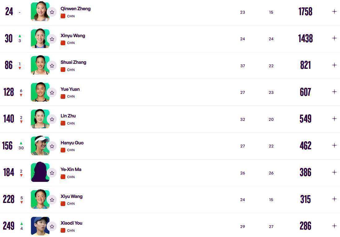 除了王欣瑜和郑钦文,中国女网还有其他球员出现在排名榜的前列。 老将张帅排在第86位,她的即时积分是823分。 在TOP100到TOP150这个区间,还有两位中国球员:袁悦排在第128位,朱琳排在第140位。 再往后看,郭涵煜排在第156位,她在WTA125米德兰站获得亚军后,排名提升了30位,创造了个人新高。 马烨欣第184位,王曦雨第228位,尤晓迪第249位,高馨妤第267位,田方然第268位。 田方然的排名也刷新了个人最佳纪录。