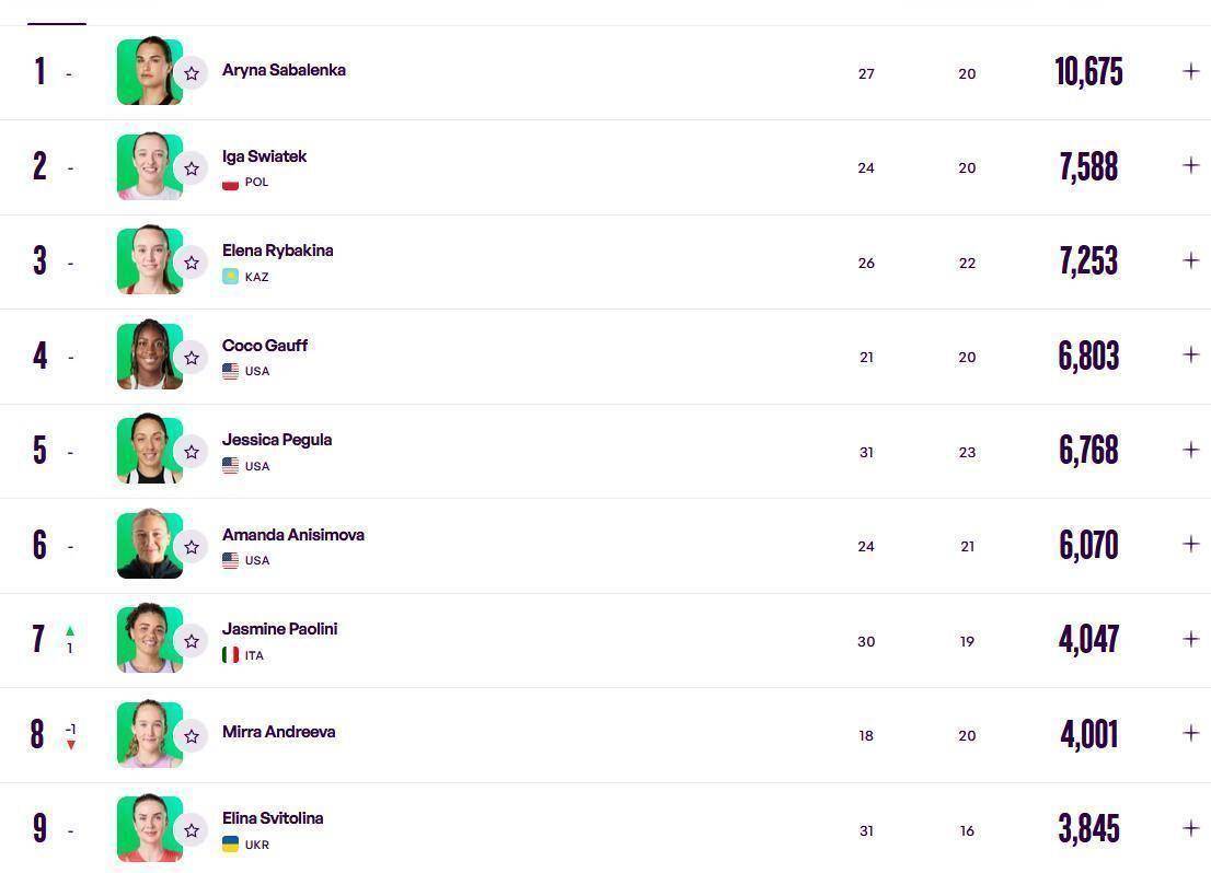 前十名中唯一的位置交换发生在第七和第八位。 意大利的鲍里妮上升一位来到第七,积分4047分;俄罗斯的米拉·安德列娃下降一位至第八,积分4001分。 安德列娃是迪拜站的卫冕冠军,但今年她在四分之一决赛中被2号种子阿尼西莫娃逆转,卫冕失败。 乌克兰的斯维托丽娜3845分排在第九,加拿大的姆博科3214分位列第十。